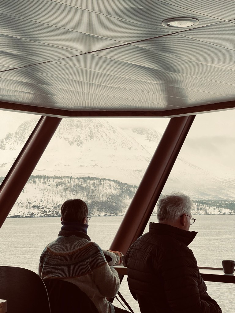 第二次做快艇出海去Finnsnes的时候,偶遇了一位当地的退休老海员。因为汽车在Tromsø抛锚,不得已才乘船回家。一起坐在快艇中的座上攀谈起来,老人家在挪威的航海圈工作了四十多年;游船,货轮,渔船都有他工作的经历。他如数家珍的诉说着自己随着船去过的地方,最远的Svalbard 和菲律宾。游船驶过峡湾,他饶有兴致的指着每一艘路过的船只,这支是巡游船,这支是渔船,云云。