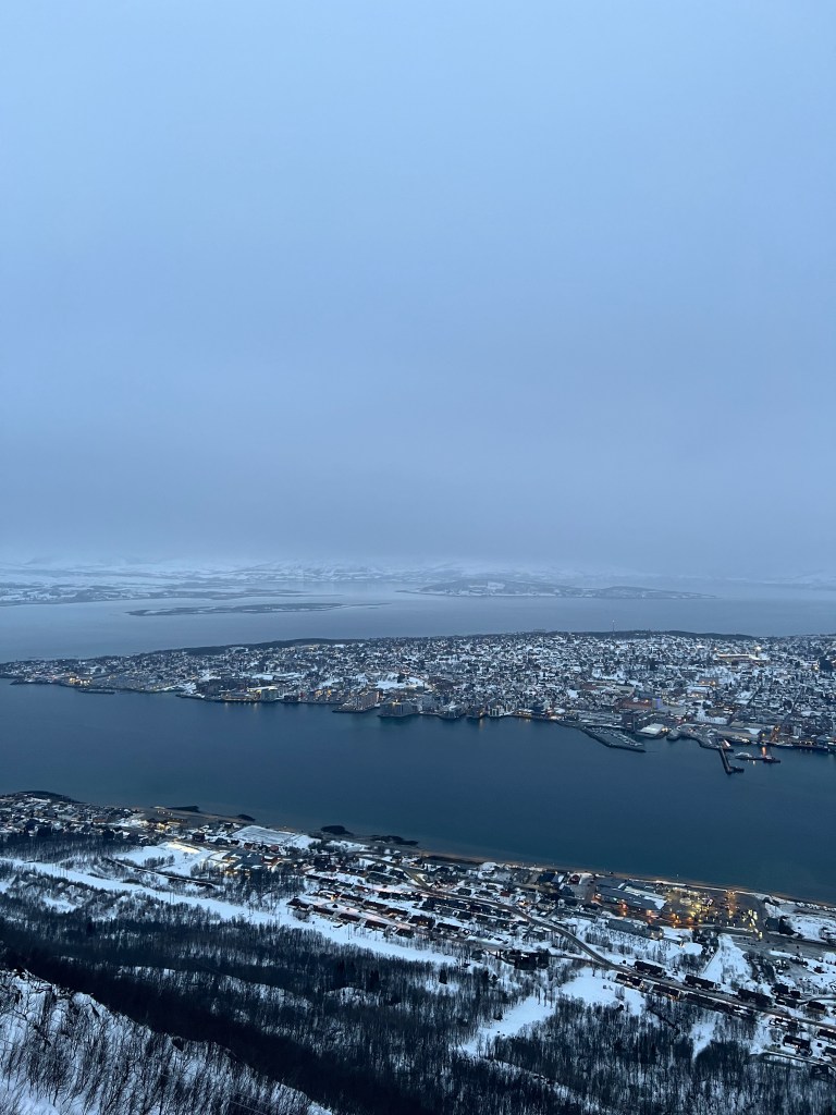 一连几天,小城上空都是厚厚的云层。追寻极光的旅程也变得漫长。车子行驶在极地的公路上,从黄昏到黑夜。两侧的峡湾随着光线,一点点的消失。远处山脚下村庄闪烁着星星点点的灯光。