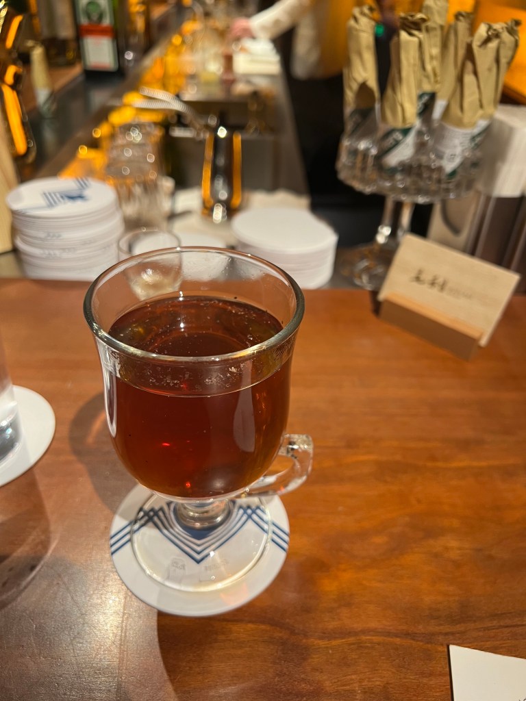 从Bellwood出来,又回到了Mori Bar Gran喝上次没喝成的bull shot。伏特加加上肉汤的umami,黑胡椒带来的一点点辣;喝下去暖融融的。当晚毛利先生不在,自己跟在吧台里的祥克靠着旁边说中文的日本客人慢慢交流起来。小伙子热情帅气也很幽默,自诩”凭借着出色的外形和幽默的性格,一定可以很快成为名调酒师“。如此逗得在座的酒客们哈哈大笑起来。