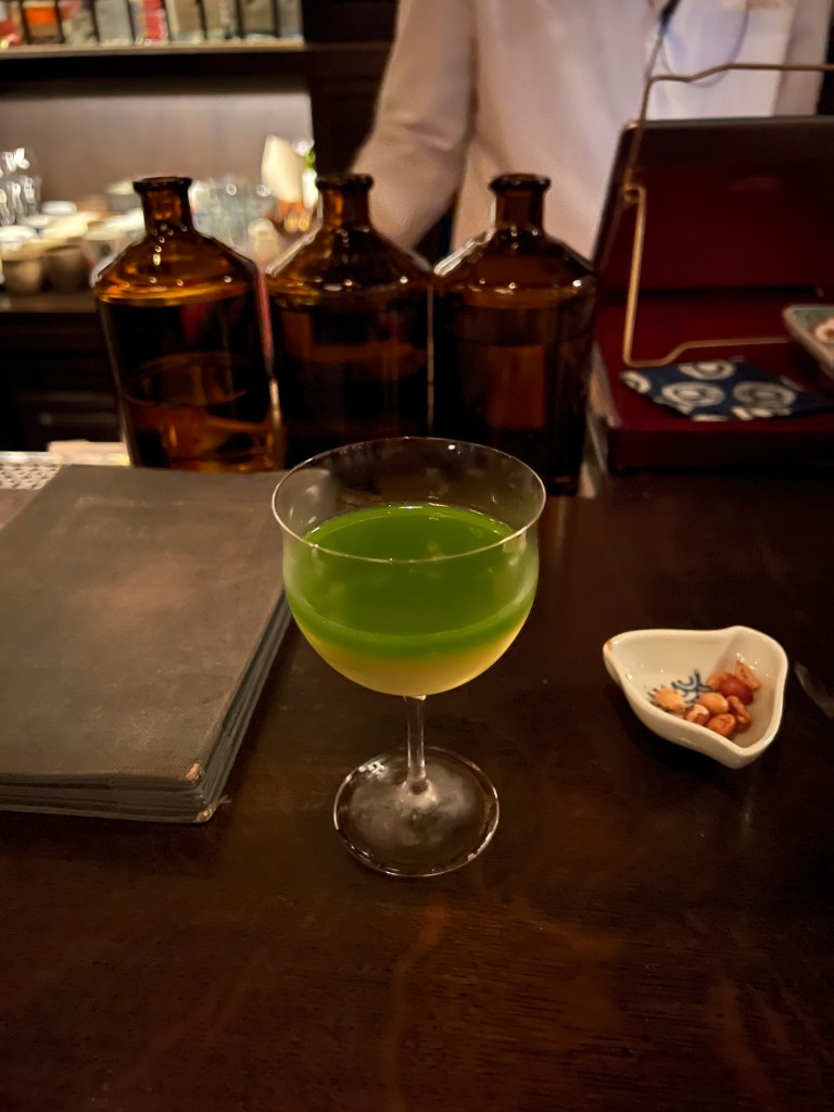 一间混搭创意小菜居酒屋以及off the tap 预调鸡尾酒的小酒吧,创意小菜在味道上很大胆,鸡尾酒的口味也是如此。作为尝鲜的话也是个蛮有意思的体验。坐在吧台和来这儿打工的女生聊了一会儿天,得知是从上海来日本学习的,以前在上海给SG group做PR方面的工作;疫情之后决定出来闯荡一下。白天在学校学习日语,到了晚上就来这里帮忙。大概在这里等了1个小时左右,被请到了楼下的Bellwood。 找了个吧台位置坐下,当晚的调酒师也是曾经在上海工作的Yumi。店里的风格融合了Prohibition style夹杂着一些日本的文化符号,音乐放的则是美国60年代的Patsy Cline 之类的音乐,知名如大学时期玩的GTA里面的k-rose 电台playlist。”Three cigarettes in an ashtray”, “All my exes live in Texas” 之类的歌曲,十分怀旧。